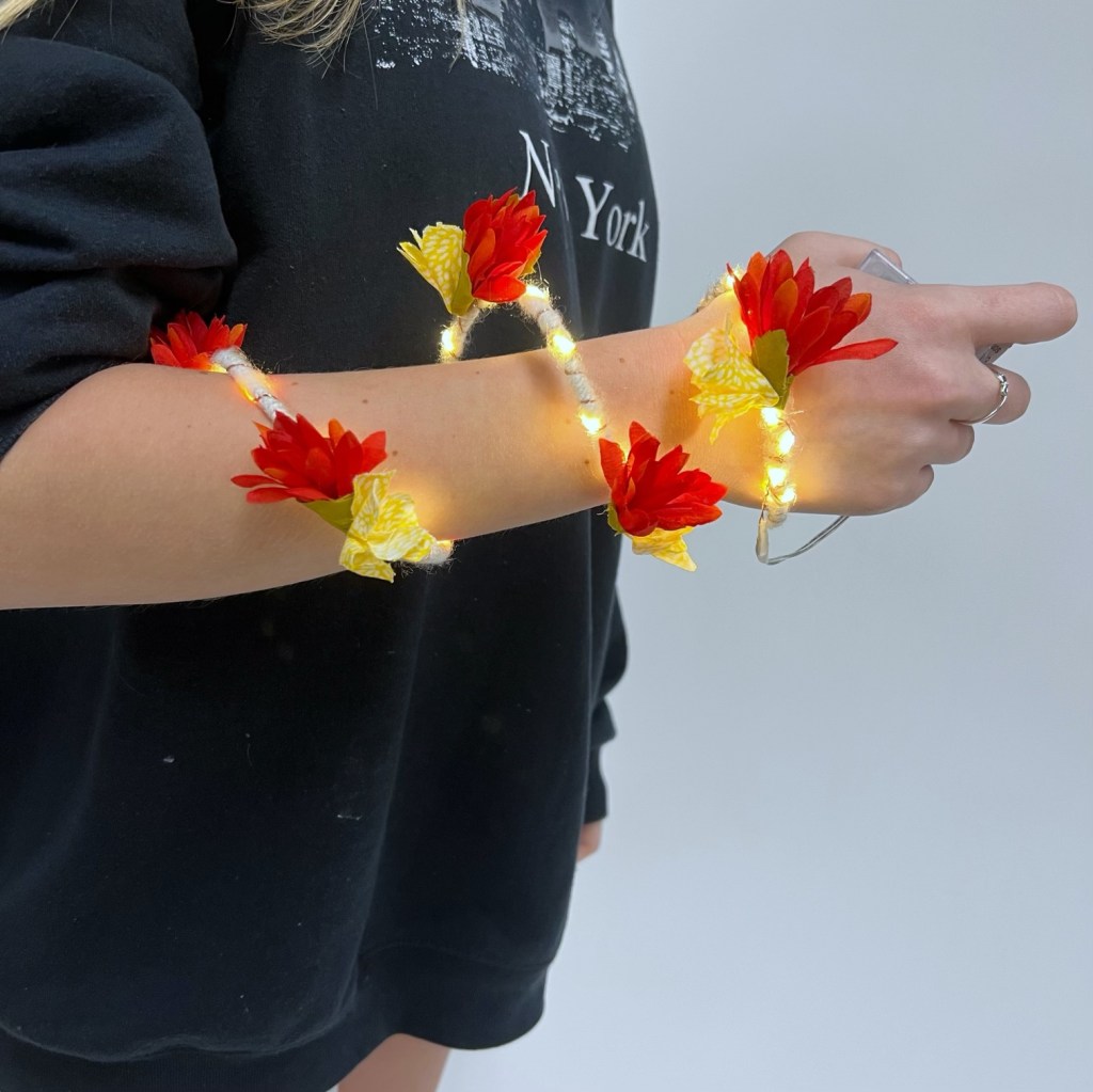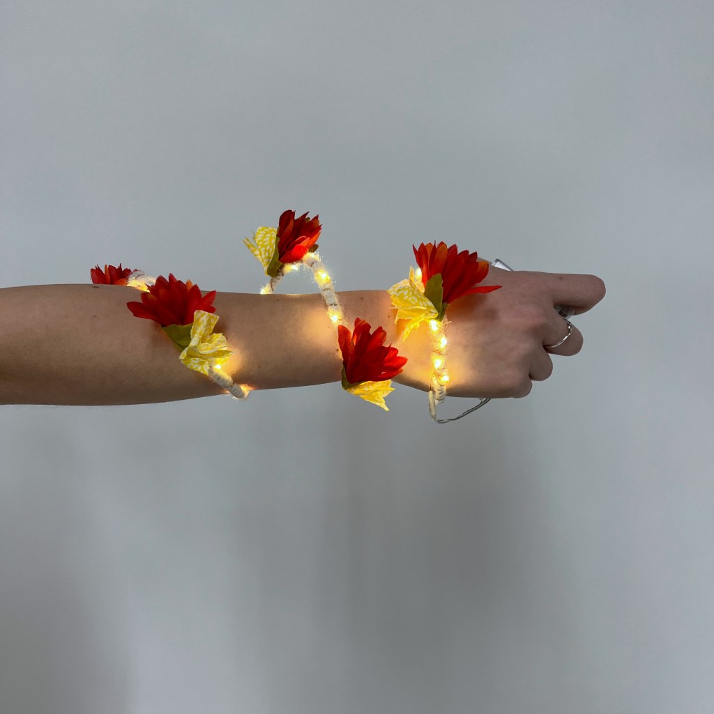 I used wire, string, fabric, and LED string lights in this project. All of these materials were chosen to create a comfortable appearing object. The fabric flowers are to remind the person of summer, the string-covered wire is meant to feel soft, and the string lights are meant to remind them of the sun. During this project, I came to terms with my experience with seasonal mood changes and it brought me joy to create an object that would positively impact me. I realized how much I recognized people’s struggles around me and how I wanted to help them, but didn’t know how. This wearable would help me solve this problem. Overall, the wearable object I created has the power to affect the moods of people who see it and to offer them confidence regarding their feelings and looks during the dreary, winter months.
