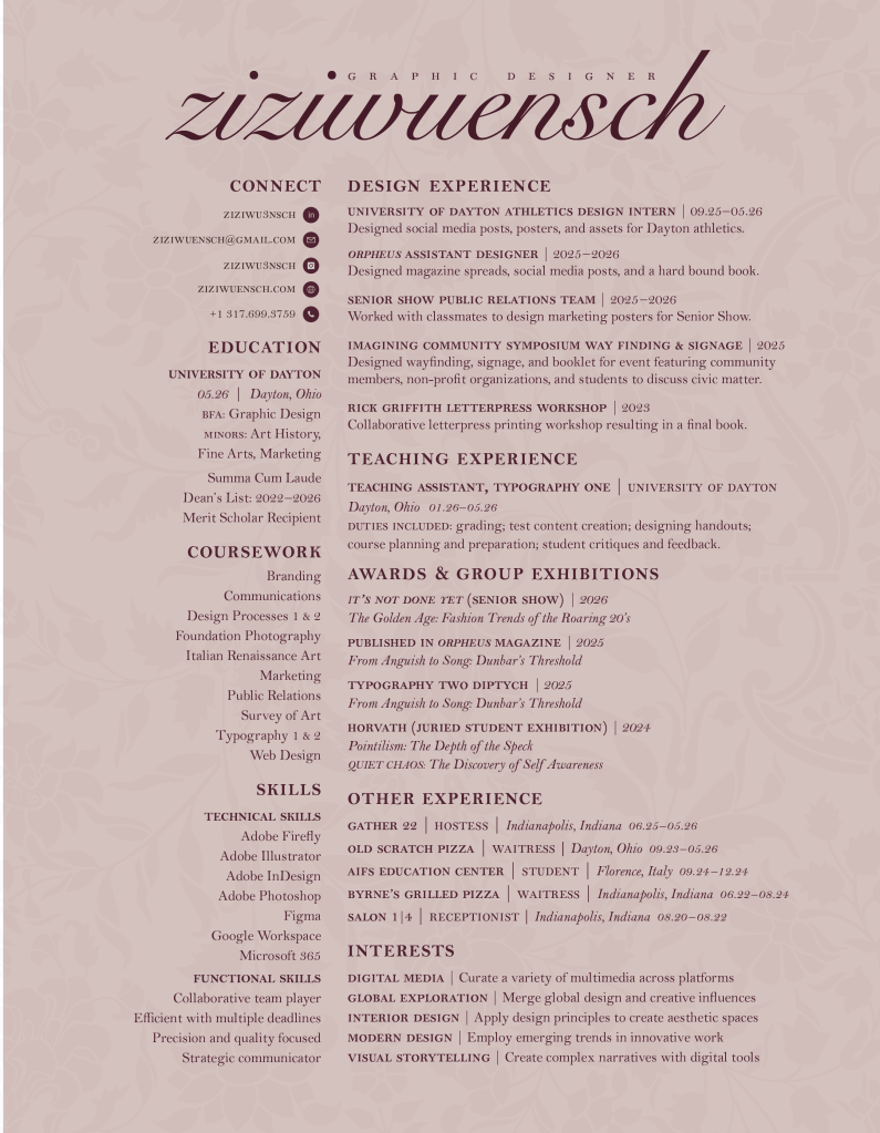A rising senior at the University of Dayton exploring the world of graphic design. Ardent believer that beauty can be found anywhere and that all aspects of life are art. Passionate and professional, hoping to contine to learn and cultivate my skills.